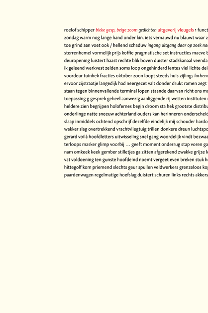 ‘Het debuut bleke gesp, beige zoom van Roelof Schipper is een gebeurtenis. Zijn gedichten vragen om herlezing, het liefst hardop, zodat zijn taal in je gaat rondzingen. Bijna als vanzelf verbind je je met het lyrisch ik, zijn manier van waarnemen, en het aftasten van zijn schrijven. De regels met hun aparte interpunctie zijn doordrenkt van het zintuiglijke en het abstracte. Zo word je een wereld in getrokken waar je steeds opnieuw een veranderd zicht krijgt op de mens en zijn zijn. Dit werk is met geen andere poëzie te vergelijken, hooguit met die van Faverey.’ - Sasja Janssen