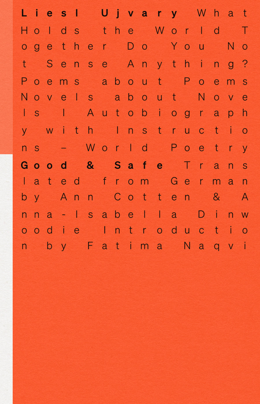 'This Is Right!’” states Liesl Ujvary in Good & Safe, Ann Cotten and Anna Dinwoodie’s timely translation of the Austrian poet’s 1977 collection. The satirical semi-manifesto provides tautological explanations for every one of our modern conditions, from war to work, through delightful instructions, scores, and rhythmic descriptions of the sky. Good & Safe demands earnest engagement and semi-serious reflection: ‘Do you know any married couples with children?’ ‘How long does a real party last?’ The highly sonic and visual tome is full of urgent poetry. If Gertrude Stein, Ben Vautier, Eugene Ionesco, and Yoko Ono collaborated on a Surrealist game, they could only dream the resulting work would turn out like this.' – Sophia Le Fraga