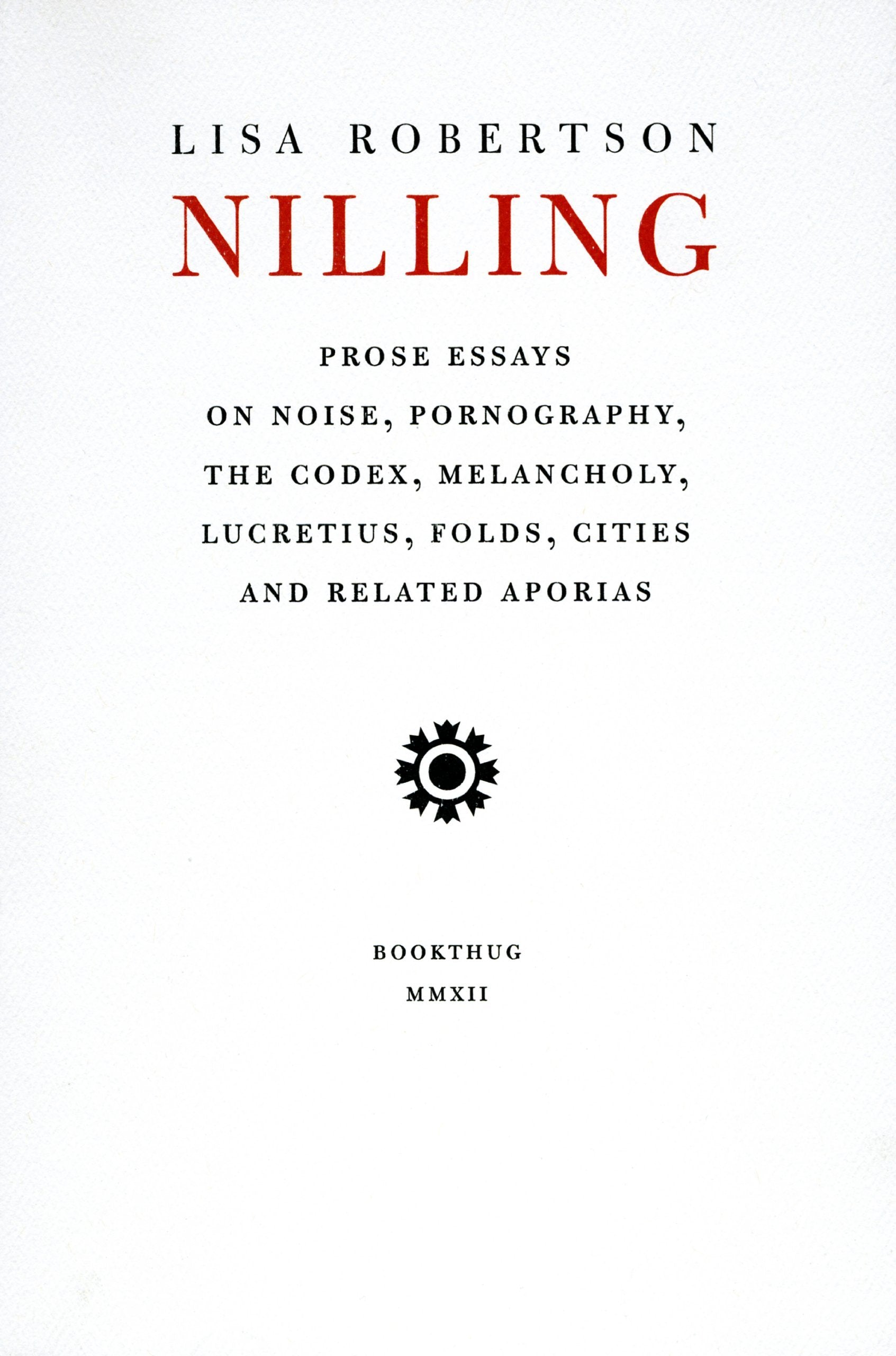Nilling is a sequence of 6 loosely linked prose essays about noise, pornography, the codex, melancholy, Lucretius, folds, cities and related aporias: in short, these are essays on reading. Lisa Robertson applies an acute eye to the subject of reading and writing―two elemental forces that, she suggests, cannot be separated.